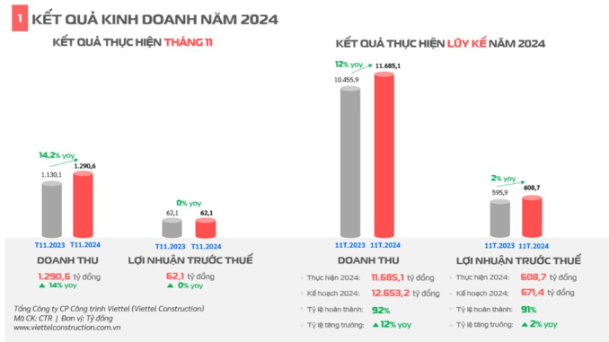 Luỹ kế 11 tháng đầu năm, Viettel Construction ước đạt hơn 11.685 tỷ đồng doanh thu và 609 tỷ đồng lợi nhuận trước thuế, lần lượt tăng 12% và 2% so với cùng kỳ 2023. Với kết quả đạt được, công ty đã hoàn thành 92% kế hoạch doanh thu và 91% mục tiêu lợi nhuận cả năm đề ra.