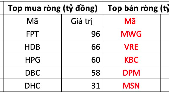 Tại chiều mua, cổ phiếu FPT được khối ngoại mua mạnh nhất trên HOSE với giá trị hơn 96 tỷ đồng. Theo sau, HDB và HPG là hai mã tiếp theo được gom 66 và 60 tỷ đồng. Ngoài ra, DBC và DHC cũng được mua lần lượt 58 và 31 tỷ đồng.
