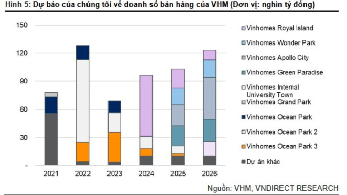 VNDirect dự báo giá trị hợp đồng ký bán của Vinhomes sẽ lần lượt tăng 10,7%/7,2%/19,4% so với cùng kỳ, đạt 96.311 tỷ đồng/103.208 tỷ đồng/123.179 tỷ đồng trong các năm 2024-26.