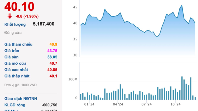 Trên sàn chứng khoán, cổ phiếu VHM đang dừng ở mức 40.100 đồng/cp, giảm 17% so với đỉnh một năm nhưng vẫn cao hơn 16% so với đáy lịch sử hồi đầu tháng 8 (thời điểm hé lộ kế hoạch mua cổ phiếu quỹ). Vốn hóa tương ứng vào khoảng 165.000 tỷ đồng (6,6 tỷ USD), xếp thứ 7 trong danh sách các công ty niêm yết giá trị nhất Việt Nam và giữ vị trí số 1 trong ngành bất động sản.