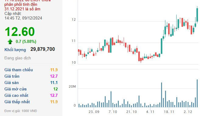 Cụ thể, kết phiên 09/12, giá cổ phiếu HAG của Công ty CP Hoàng Anh Gia Lai ở mức 12.600 đồng/cổ phiếu, tăng 5,88% so với phiên trước, khối lượng cổ phiếu giao dịch khớp lệnh tăng đột biến, đạt gần 30 triệu đơn vị – tăng gần gấp 3 lần phiên trước.