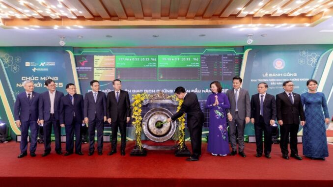 Bộ trưởng Bộ Tài chính Nguyễn Văn Thắng thực hiện nghi thức đánh cồng khai trương phiên giao dịch chứng khoán đầu năm 2025