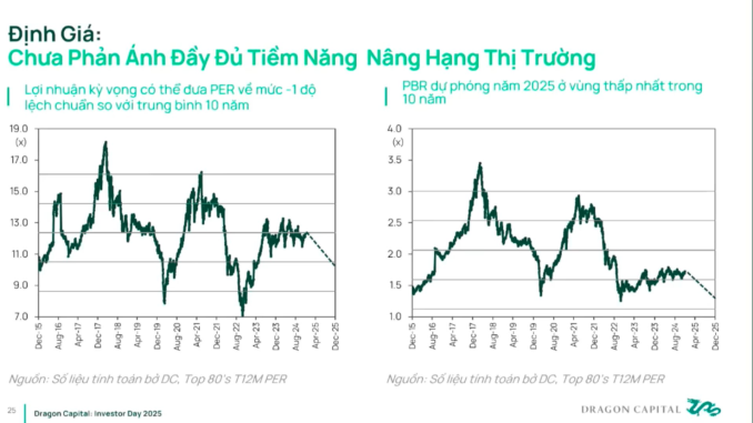 Thêm vào đó, định giá chưa phản ánh đầy đủ tiềm năng nâng hạng thị trường. Cuối năm 2025, lợi nhuận kỳ vọng có thể đưa PER về mức -1 độ lệch chuẩn so với trung bình 10 năm. Chỉ số PBR dự phóng năm 2025 cũng ở vùng thấp nhất trong 10 năm. Với mức tăng trưởng lợi nhuận kỳ vọng, chuyên gia cho rằng định giá thị trường đang ở mức khá hấp dẫn.