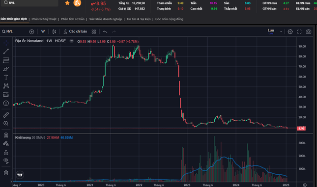 Nếu so với đỉnh lịch sử 92.370 đồng/cổ phiếu hồi tháng 6/2021 (giá đã điều chỉnh), thị giá của NVL hiện thấp hơn 90%, tương đương với vốn hóa “bốc hơi” gần 163.000 tỷ đồng.