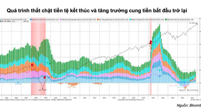 Trong báo cáo mới đây, Chứng khoán Agriseco nhận định trong bối cảnh lạm phát tiếp tục xu hướng giảm và tiệm cận mục tiêu của các NHTW, thị trường lao động toàn cầu cân bằng trở lại. Qua đó, tạo điều kiện để các NHTW tiếp tục lộ trình hạ lãi suất. Hiện tại có khoảng 70% NHTW trên thế giới đã ra quyết định hạ lãi suất và tăng trưởng cung tiền M2 bắt đầu phục hồi trở lại sau giai đoạn thắt chặt 2022-2023.