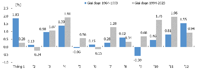 Bình quân tỷ suất sinh lợi VNINDEX theo tháng giai đoạn 2000-2024. Nguồn: KIS