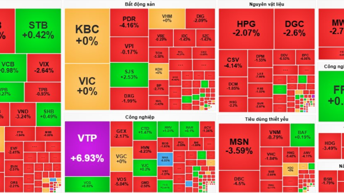 Tương tự, nhóm cổ phiếu bất động sản cũng “chìm” trong sắc đỏ khi bị nhà đầu tư đồng loạt bán tháo, với PDR -4,16%, NTL -4,37%, DTD -4,43%, SIP -2,71%, CEO -3,85%, TCH -3,38%, DIG -2,09%, DXG -1,99%, IDC -1,45%, SZC -1,43%, HDC -1,79%, NVL -1,42%, …