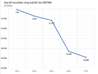 Dòng vốn ngoại ghi nhận đà bán ròng mạnh xuyên suốt trong 5 phiên giao dịch, trong đó tâm điểm dồn vào phiên thứ Năm.