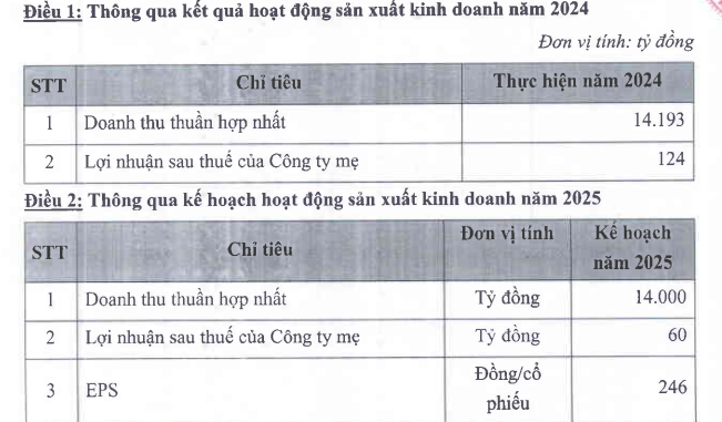 Đại hội sắp tới sẽ thông qua các nội dung như: Kết quả hoạt động sản xuất kinh doanh năm 2024 và kế hoạch hoạt động sản xuất kinh doanh năm 2025 của Công ty; Báo cáo hoạt động của Hội đồng quản trị, Ban kiểm soát năm 2024, phương hướng hoạt động năm 2025; Báo cáo tài chính riêng, hợp nhất năm 2024 đã được kiểm toán; Mức thù lao của Hội đồng quản trị và Ban kiểm soát năm 2025; Phương án phân phối lợi nhuận năm 2024; Tờ trình của Ban Kiểm soát về việc lựa chọn đơn vị thực hiện kiểm toán các Báo cáo tài chính của Công ty năm 2025…