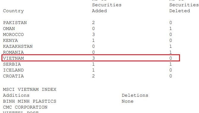 Như vậy, rổ danh mục MSCI Frontier Market Index tăng lên 9 mã cổ phiếu sau kỳ review tháng 2, tổng cộng còn 220 mã. Tại ngày 31/1, Việt Nam vẫn là quốc gia chiếm tỷ trọng cao nhất trong rổ chỉ số của MSCI Frontier Market Index với tỷ lệ 24,69%. Xếp thứ 2 là Morocco với gần 13%.