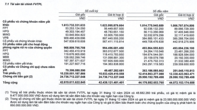 Danh mục FVTPL của VND ghi nhận 24.519 tỷ đồng, tăng 46% so với đầu năm và chiếm tới 55% tổng tài sản của công ty. Trong đó, công ty nắm giữ hơn 1.442 tỷ đồng cổ phiếu và chứng chỉ quỹ niêm yết (giá gốc), riêng khoản đầu tư vào cổ phiếu VPB đang tạm lỗ nhẹ 30 tỷ đồng.
