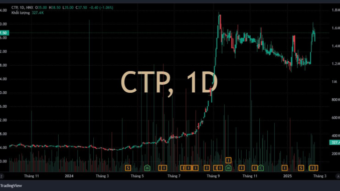 Trên sàn chứng khoán, cổ phiếu CTP trở thành hiện tượng lạ khi tăng “bốc đầu” trong thời gian ngắn. Từ vùng giá 4.000-5.000 đồng/cp đầu tháng 5/2024, cổ phiếu CTP bất ngờ tăng dựng đứng lên vùng đỉnh 43.000 đồng/cp vào tháng 9/2024, tức gấp khoảng 10 lần sau 4 tháng.