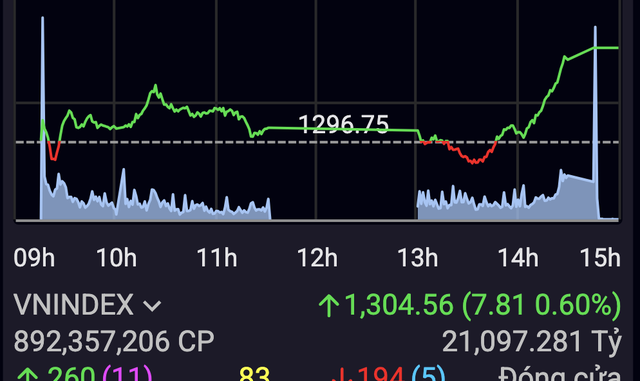 VN-Index có phiên tăng thứ 5 liên tiếp với khối lượng khớp lệnh đạt mức cao nhất từ đầu 2025 đến nay và tăng vọt 38,8% so với mức trung bình 20 phiên. Sắc xanh chiếm ưu thế trên các nhóm ngành, nhất là chứng khoán, thép…, giúp thị trường vượt mốc tâm lý 1.300 điểm sau khi đóng cửa cao nhất phiên.