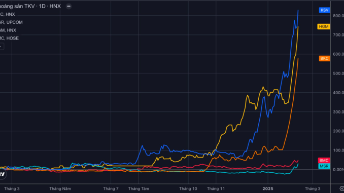 Thị trường chứng khoán đang chứng kiến một con sóng thần trên nhóm cổ phiếu khoáng sản. Chỉ trong một thời gian ngắn, một loạt cổ phiếu tăng bằng lần, có thể kể đến như Khoáng sản TKV (Vimico – mã KSV), Khoáng sản Hoàng Mai (mã HGM), Khoáng sản Bắc Kạn (mã BKC). Khiêm tốn hơn, Khoáng sản Bình Định (Bimico – mã BMC), Masan High-Tech Materials (mã MSR),… cũng đã tăng hàng chục % từ đầu năm.