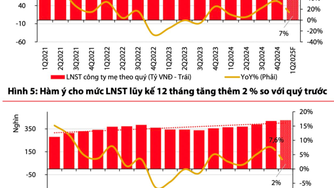 Mức tăng trưởng trong quý 1/2025 dự báo có sự giảm tốc về còn 7% khi mất đi hiệu ứng nền thấp của cùng kỳ năm trước. Nhóm phi tài chính giảm nhẹ do biên lợi nhuận bình thường hóa, trong khi đó nhóm dịch vụ tài chính bị ảnh hưởng bởi vòng quay tài sản khi thanh khoản thị trường duy trì mức thấp so với cùng kỳ. Dẫn dắt cho mức tăng trưởng trong quý đầu năm dự báo đến từ nhóm bất động sản (46% svck) và ngân hàng (10% svck).