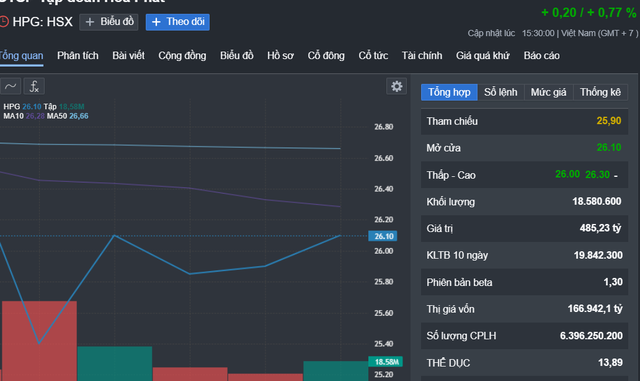 Cụ thể, kết phiên giao dịch cuối tuần, ngày 14-2, cổ phiếu HPG lên mức 26.100 đồng/cổ phiếu, tăng 0,7% so với giá tham chiếu, hơn 2,7% so với phiên giảm mạnh đầu tuần nhưng vẫn giảm 2,06% so với cuối tuần trước.