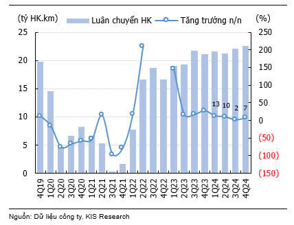 Theo báo cáo cập nhật ngành Hàng không của Chứng khoán KIS, trong quý IV năm 2024, mặc dù số lượng hành khách giảm nhẹ 1% n/n, tuy nhiên luân chuyển hành khách tăng 7% n/n nhờ vào sự gia tăng đáng kể về lượng khách Quốc tế, đạt 4.88 triệu hành khách, tăng 31% n/n, đặc biệt là từ Trung Quốc, Ấn Độ và Hoa Kỳ. Theo quan sát của KIS, điều này đến từ việc thời tiết trong quý IV tốt hơn quý III, đồng thời các chương trình xúc tiến du lịch nhân dịp kỷ niệm 75 năm thiết lập quan hệ ngoại giao Việt Nam – Trung Quốc cũng góp phần thu hút du khách từ thị trường này. Số lượng du khách Việt Nam đến một số nước theo thống kê của KIS cũng có dấu hiệu phục hồi vào cuối quý IV năm 2024.