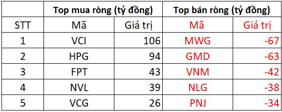 Ngược chiều, cổ phiếu VCI được mua ròng mạnh nhất toàn thị trường với giá trị 106 tỷ đồng; HPG cũng được rót ròng mạnh 94 tỷ đồng. Các mã khác cũng được mua ròng khoảng 26 tỷ đến 43 tỷ đồng là FPT, NVL, VCG.
