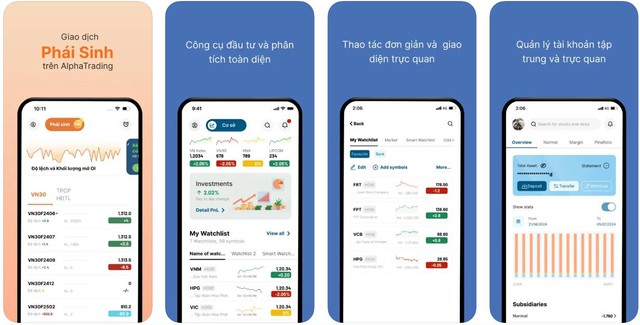 Cụ thể, với AlphaTrading, người dùng dễ dàng mở tài khoản chứng khoán bằng eKYC chỉ với 2 phút; đa dạng các nhóm đầu tư; quản lý danh mục đầu tư và tổng tài sản một cách khoa học; thuận tiện phân tích thị trường ngay trên thiết bị di động thông qua hệ thống chart và các công cụ phân tích kỹ thuật chuyên sâu; kịp thời nhận thông tin và báo cáo phù hợp theo hành vi và khẩu vị của người dùng để tối ưu hóa lợi nhuận; nhanh chóng nhận cảnh báo thông minh giúp khách hàng nắm được các thay đổi quan trọng của thị trường…