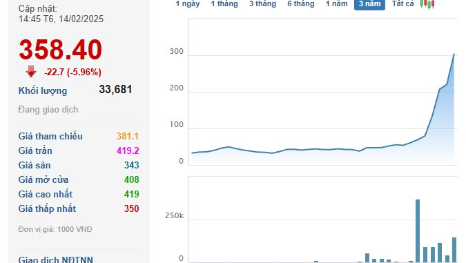 Trong số đó, mã HGM của Công ty cổ phần Cơ khí và Khoáng sản Hà Giang có thời điểm trong phiên 14/2 đã tăng dựng đứng lên vùng đỉnh mới 419.000 đồng/cp. Tuy nhiên áp lực về cuối phiên khiến cổ phiếu này ngược dòng giảm gần 6% xuống 358.400 đồng/cp.