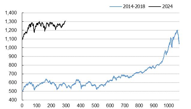 Diễn biến của VN-Index trong giai đoạn 2014-2016 và năm 2024. Nguồn: KIS