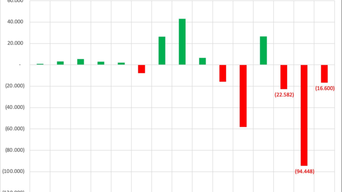 Nhìn rộng ra, trong 27 tháng trở lại đây, khối ngoại chỉ tạm dừng xả hàng trong tháng 1, 3/2023 và tháng 1/2024. Giá trị bán ròng của khối ngoại trên thị trường chứng khoán Việt Nam kể từ đầu năm 2023 tới hiện tại đã xấp xỉ 134.000 tỷ đồng, đồng nghĩa khoảng 5,2 tỷ USD vốn ngoại đã bị rút ra khỏi sàn chứng khoán Việt.