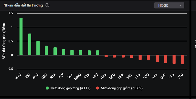 Về mức độ ảnh hưởng, CTG, TPB, GVR và NAB là những mã có ảnh hưởng tiêu cực nhất đến VN-Index với hơn 1,1 điểm giảm. Ở chiều ngược lại, VHM, VIC, VNM và GAS là những duy trì sắc xanh khá tốt và góp hơn 3 điểm vào chỉ số chung.
