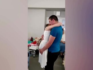 Nữ y tá Oksana Balandina cụt chân mặc váy cưới được chồng là Viktor Vasyliv bế trên tay, xoay người theo điệu vũ trong bệnh viện.