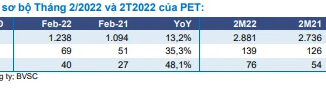 Tính chung 2 tháng đầu năm, doanh thu thuần của PET đạt 2.881 tỷ đồng, lợi nhuận trước thuế đạt 76 tỷ đồng, lần lượt tăng 5,3% và 40,7% so với cùng kỳ.